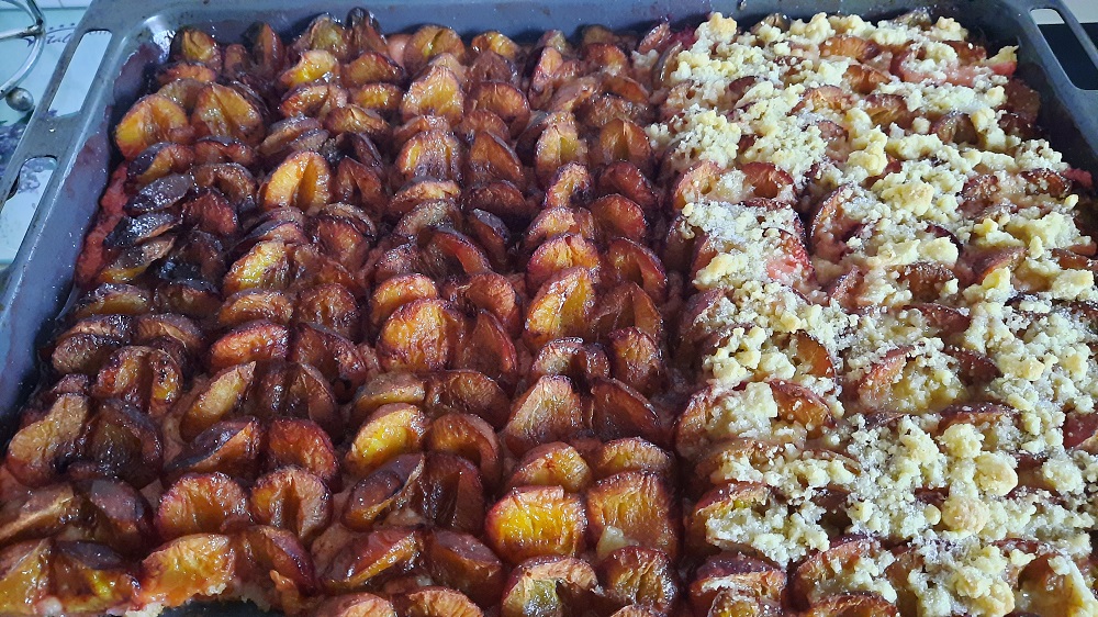 Aus den Zutaten einen Teig kneten, auf ein gebuttertes normales Ofenblech drücken, wer mag kann vorher Pflaumenmus oder Mirabellenmarmelade darauf streichen, mit halbierten Zwetschgen belegen, kräftig mit Zimt/Zucker bestreuen, auf eine Hälfte Öl darüber geben, auf die andere Seite Streusel streuen.