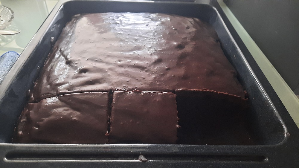 Teig: 250g Sahna oder Butter, 300g Zucker, 4 Eier, 1 Prise Salz, 1 Becher Saure Sahne, 50g Kakao, 7g Natron, 360g Mehl,