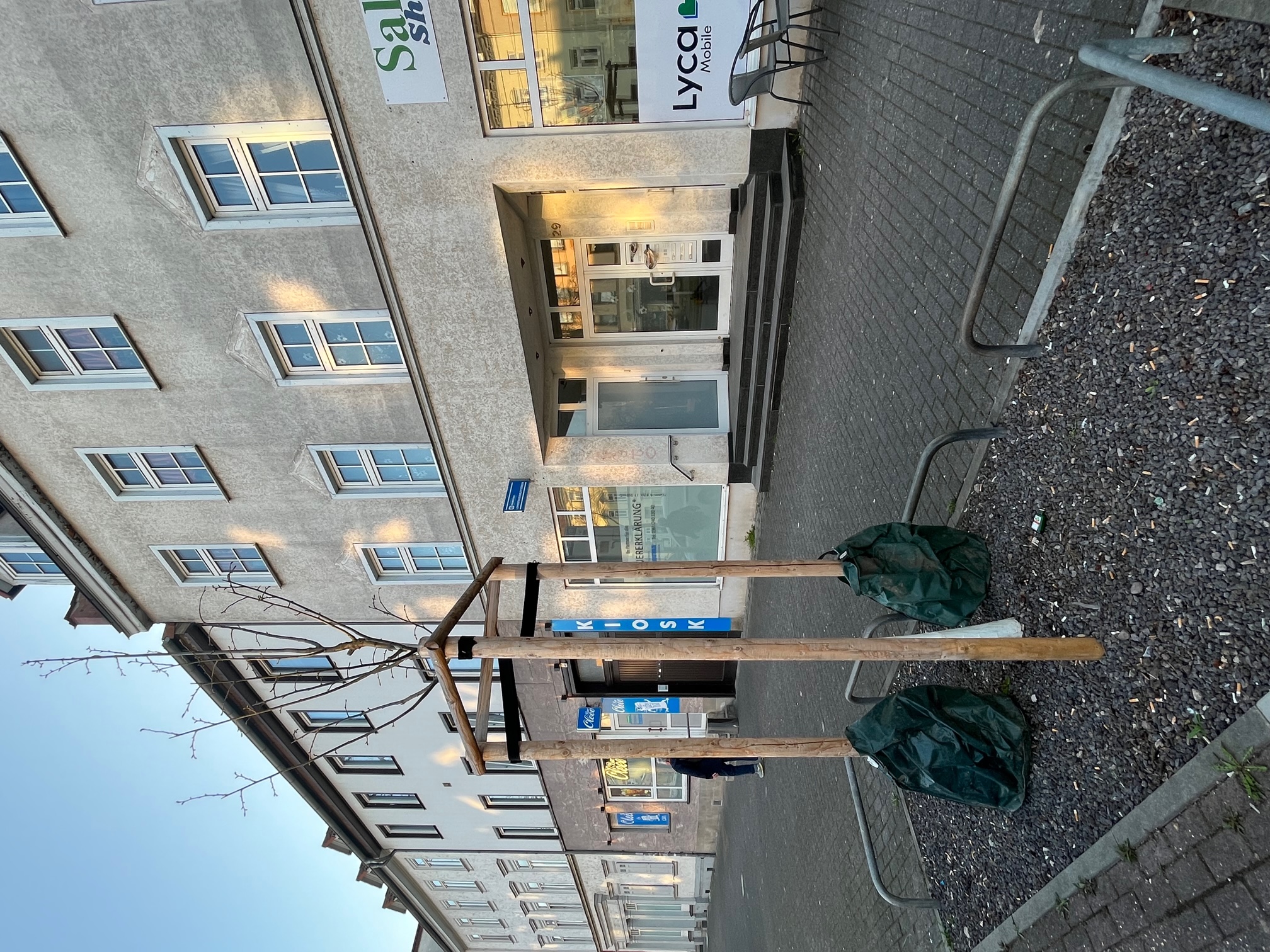 Auch ein Austausch der Erde optimiert die Bedingungen für die Gehölze.  Solange sie anwachsen, werden sie von einer Holzkonstruktion gestützt. Bewässerungssäcke bringen langsam und regelmäßig Wasser an die Wurzeln,