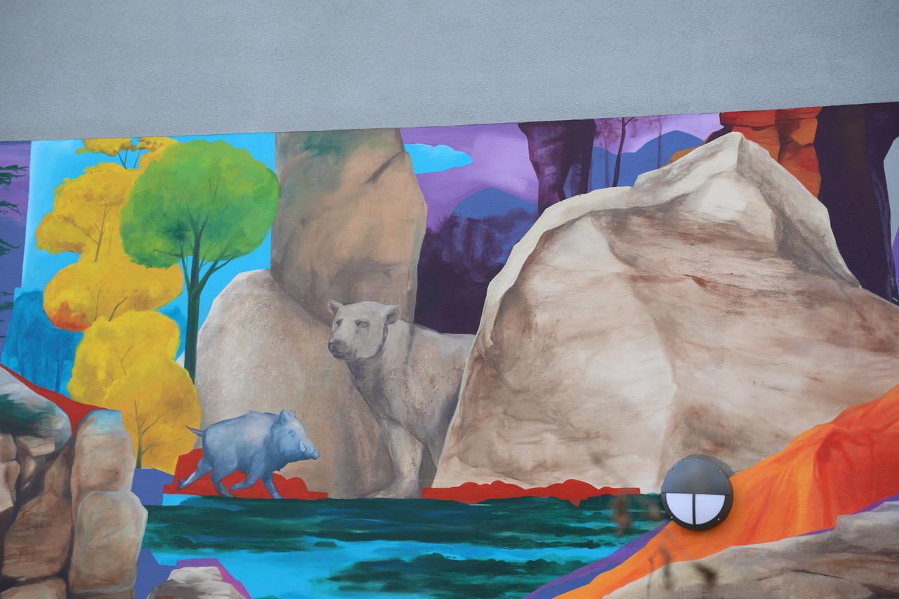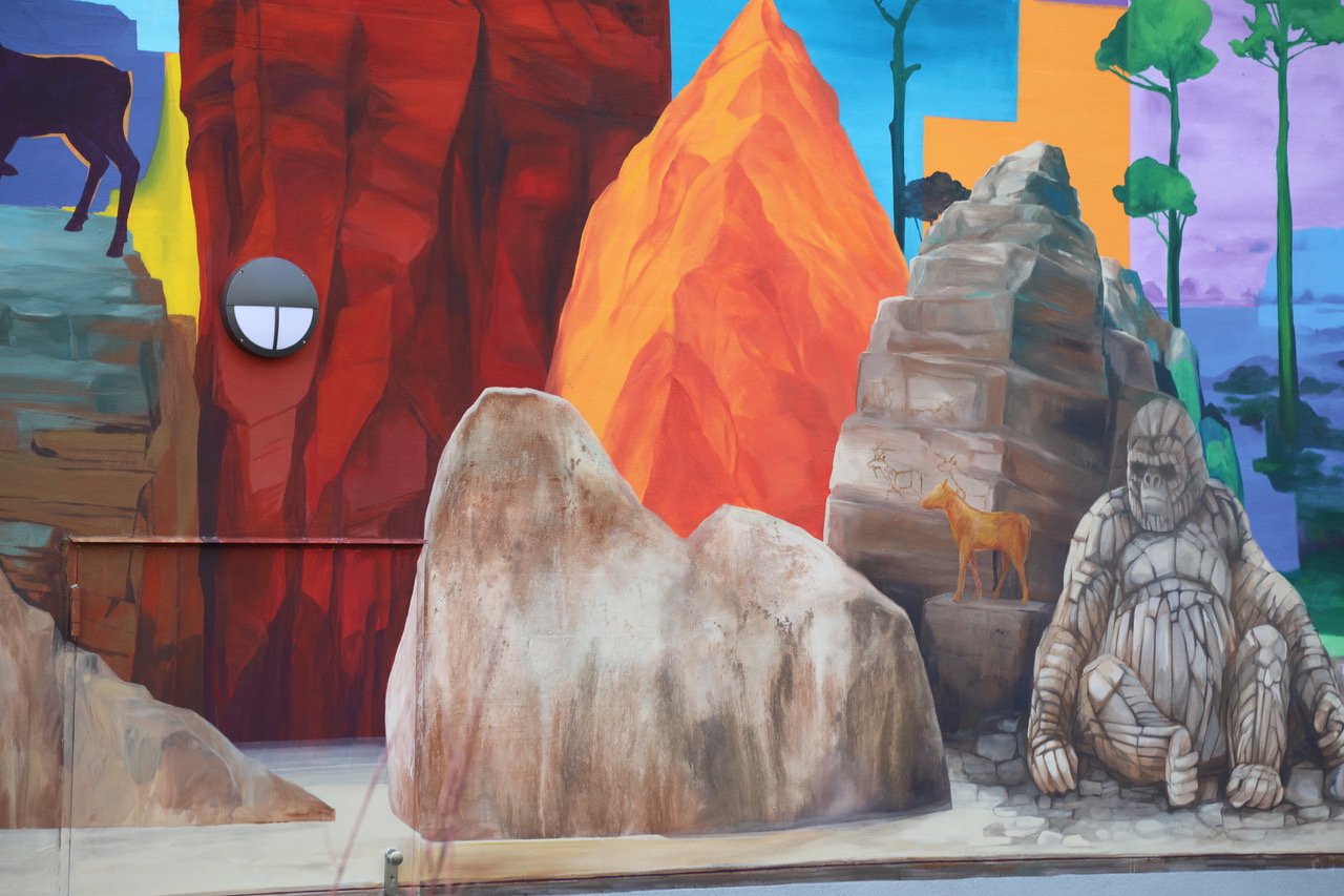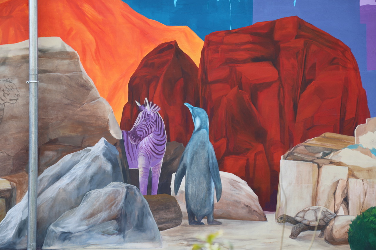 Die Außenwand des Ende letzten Jahres eröffneten Zoopark Centers am Roten Berg ziert nun ein auffälliges, farbenfrohes Gemälde. Hier ein optisches Highlight zu schaffen, das die Verbindung des Ortsteiles zu „seinem“ Zoo thematisiert, war der Wunsch des Ortsteilrates und des Investors, der Zehentner & Seidel Immobilien GmbH, der auch die Kosten für das Gemälde trug.