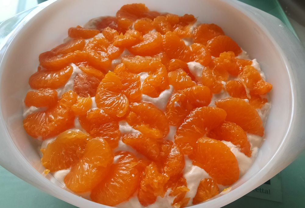 Mandarinen abtropfen lassen,  Zitrone auspressen und etwas Schale abreiben, Eier trennen, Eiweiß mit einer Prise Salz steif schlagen, langsam Zucker dazu geben.