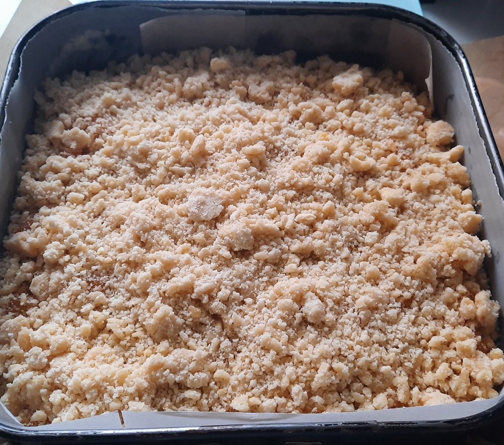 Teig: 150g Margarine, 250g Mehl, 125g Zucker, 1 Eigelb, Schale einer Zitrone, davon Streusel herstellen. Die Hälfte als Boden in eine Tortenform drücken.
