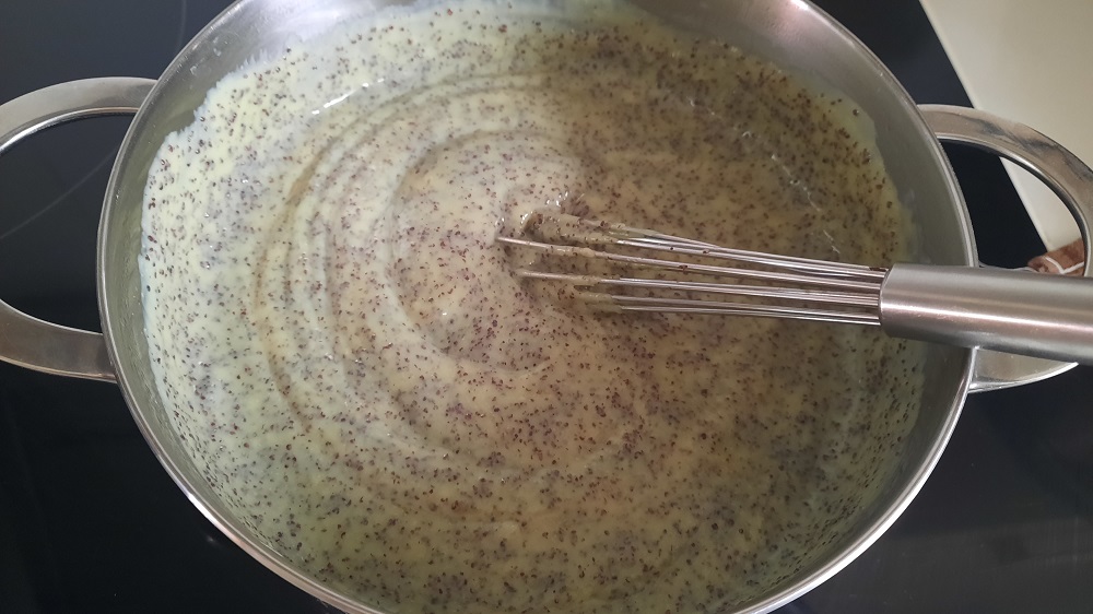 Mohnfüllung: 750ml Milch, 2 P Pudding, 50g Puderzucker, davon einen Pudding kochen, 2 P Mohn-Fix  in den Pudding rühren, kalt stellen.