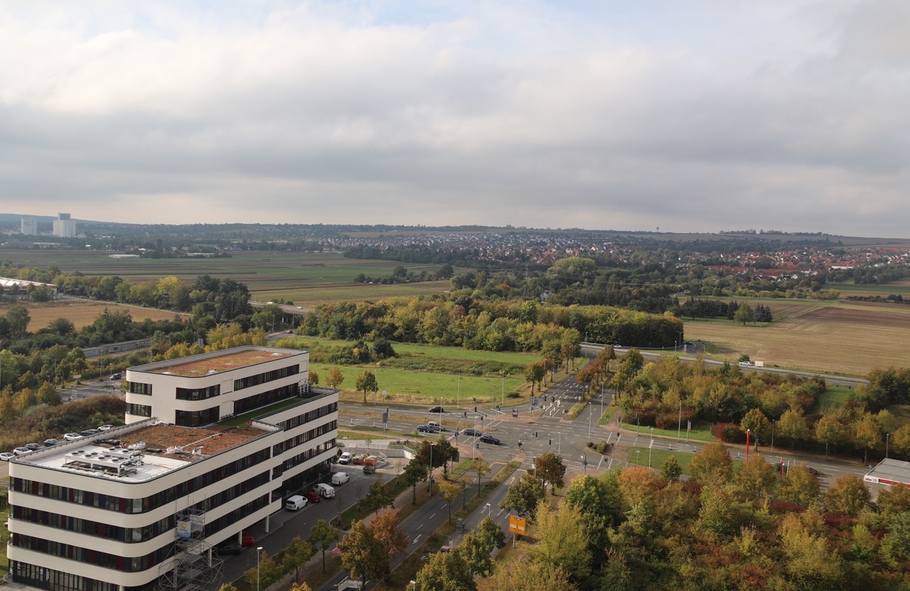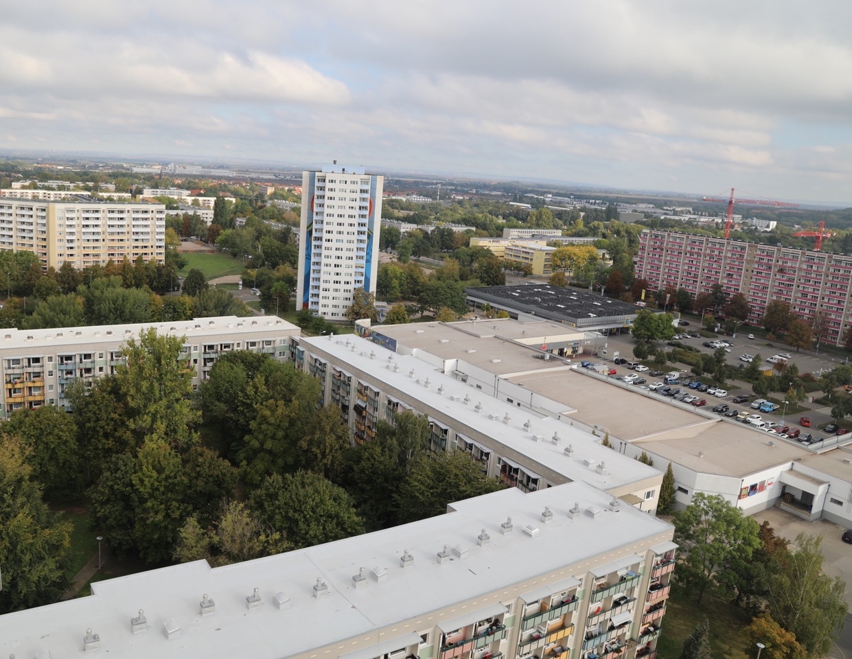 Wir hatten Gelegenheit, vom Dach der Budapester Straße 37 Fotos zu machen: In Richtung Moskauer Meile und Rigaer Straße, auf die gegenüberliegende Seite, wo das neue Ärztehaus aber auch der Baumarkt zu erkennen sind. Leider war die Sicht nicht klar, aber vergleichen mit den der alten Aufnahme – das geht allemal!