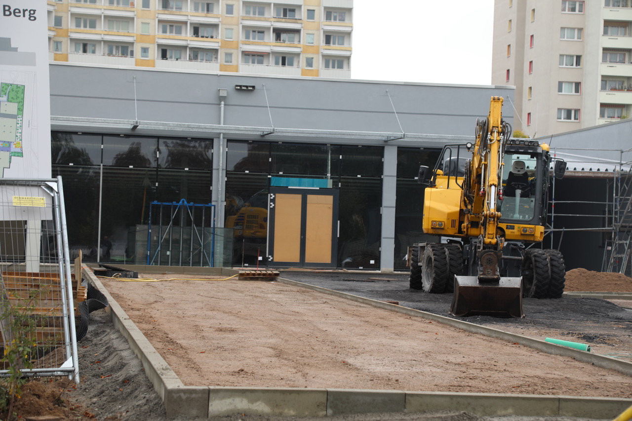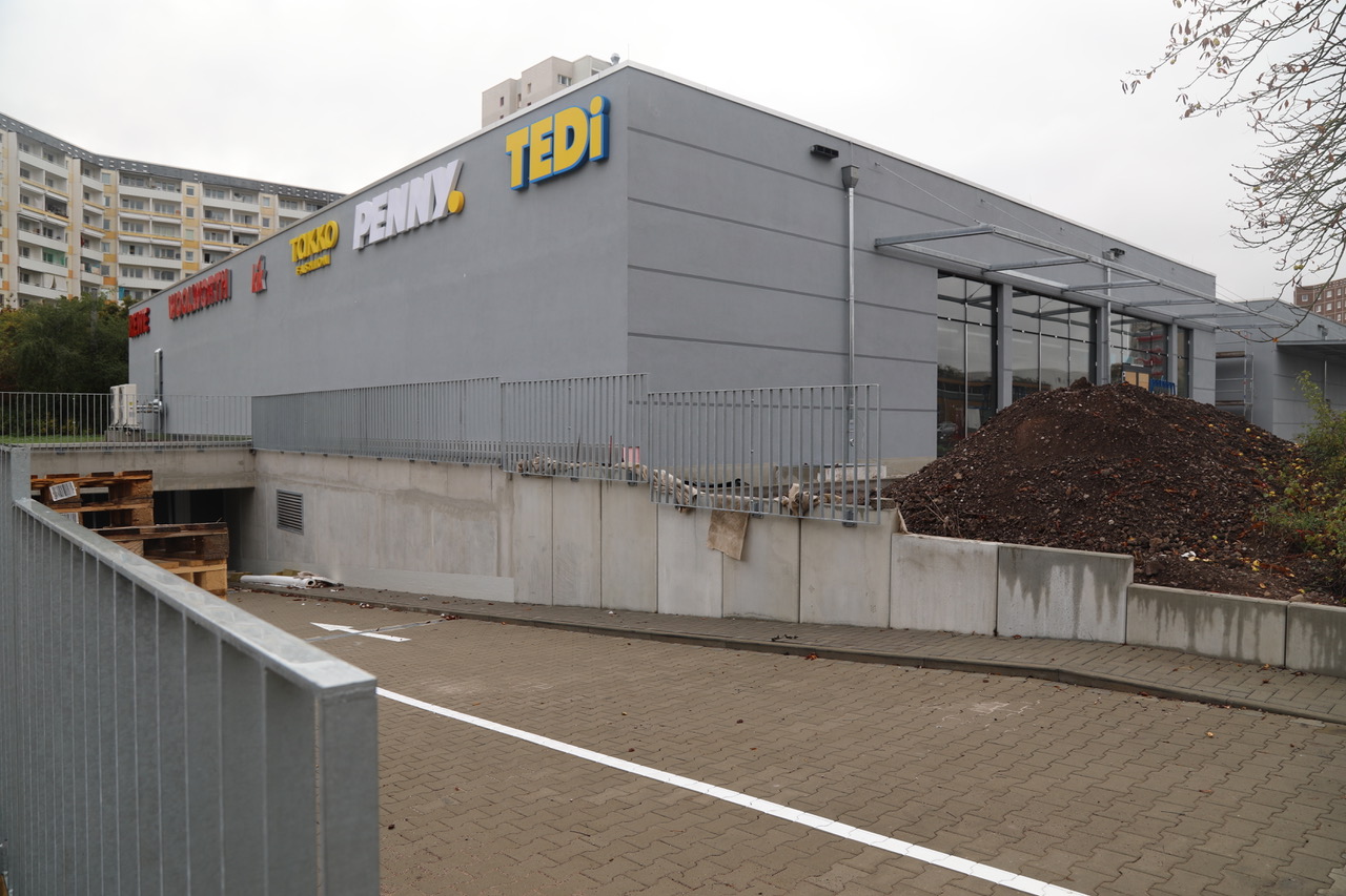 Das moderne Zoopark Center wird eine umfassende Nahversorgung der Bewohner des Roten Bergs sichern und darüber hinaus ein attraktives Ortsteilzentrum bilden. In Kürze haben dann auch die provisorischen Container-Verkaufsstellen ausgedient, die nach dem Abriss des vormaligen Einkaufszentrums immerhin das Notwendigste in fußläufiger Entfernung offerierten.