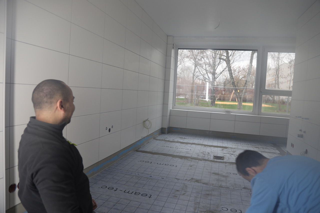 Im zuerst modernisierten Gebäudeteil befinden sich derzeit die Ausbaugewerke weiter in Umsetzung. Die Fußbodenheizung ist längst installiert, der neue Zuschnitt der Räume durch Tockenbauarbeiten abgeschlossen. Die Verlegung der Fliesen ist weit fortgeschritten, Malerarbeiten in etlichen Räumen bereits abgeschlossen. In Kürze ist die Verlegung des Bodenbelags vorgesehen.