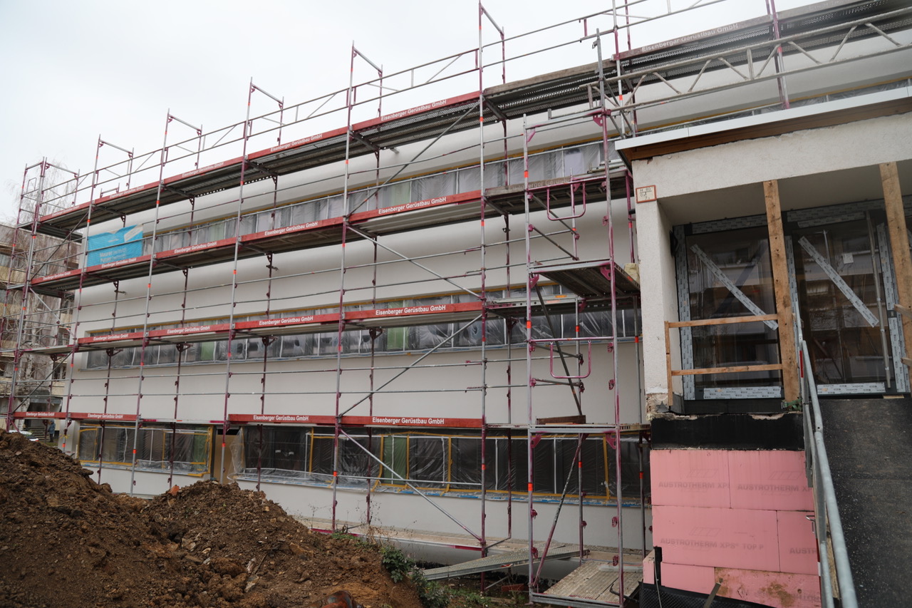 Im zweiten, zeitversetzt modernisierten Gebäudeteil ist die Fußbodenheizung installiert und der Estrich eingebaut. Im Verlauf des Jahres wird der Aufzug installiert, woraufhin die weiteren Ausbaugewerke folgen.